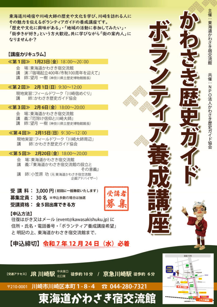東海道川崎宿や川崎大師の歴史や文化を学び、川崎を訪れる人にその魅力を伝えるボランティアガイドの養成講座です。「歴史や文化に興味がある」・「地域の活動に参加してみたい」・「街歩きが好き」という方 大歓迎。共に学びながら「街の案内人」になりませんか?